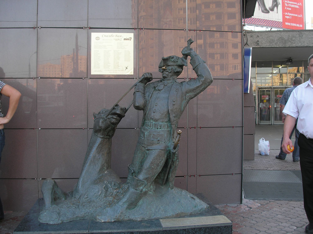 А для тех, кому не хватает отваги мы советуем съездить на станцию метро Молодежная. Здесь у метро найдите памятник великому фантазеру Барону Мюнхгаузену подержитесь за его шпагу, и тогда вы непременно станете отважными и смелыми как барон Мюнхгаузен. А вот если потереть нос барона, то тогда никто не сможет обвести вас вокруг носа. А если вы подержитесь за уши коня, то вы будите благодарными слушателями.