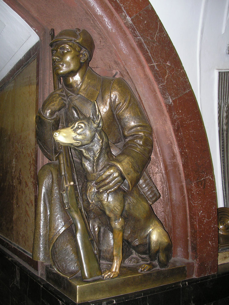 За день перед экзаменом нужно потереть нос бронзового пса на станции метро Площадь революции. И удача обязательно улыбнется вам, и вы точно сдадите экзамен. Эта примета настолько понравилась всем, что не только студенты стали тереть нос пса, но и многие, кто давно окончил институт, делают это «на удачу». Так примета распространилась на пистолет солдата и на гребешок петуха. Именно поэтому эти части скульптур сильно отличаются по цвету.