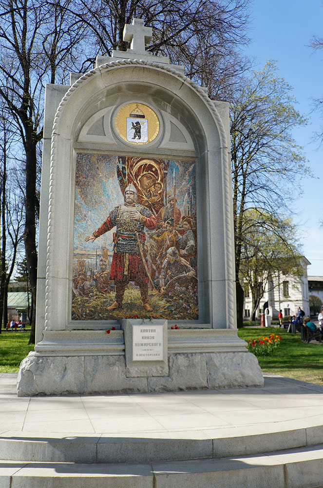 A monument-stele “Oath of the prince Pozharsky” it is a stele with arc shape and with the cross on the top. There is a mosaic of the picture “Oath of the prince Pozharsky” which was painted by the painter Vasily Igorevich Nesterenko. On the bottom part of the stele there is a plaque with memorial inscription: “Oath of the prince Pozharsky. V. Nesterenko”. Above the mosaic there is an image of the Coat of arms of Yaroslavl.