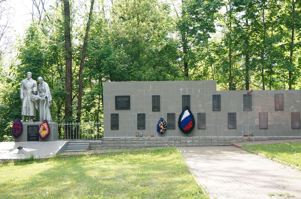 From the left side of the stele there is a monument of the soldier and woman who are sorrowing for killed defenders. There is a memorial plate on the pedestal, “An imperishable memory of heroes who were killed during the fights against the Nazi aggressors for the freedom of the village Kolubakino. 12 December 1941”. In front of the monument there is an eternal flame. From the right side of the stele there are two headstones of the graves of the Soviet Union hero a pilot Sergey Bogachev, Alexander Kurlyanskiy and Kurt Remling.