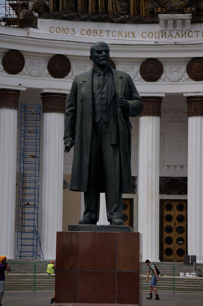 Go to metro station VDNH and exit forward 1st Cross Travel Street. Turn left and go ahead to the Longitudinal Travel Street where the main entrance to the All-Russia Exhibition Centre is. When you will go in the Exhibition center you will see beautiful building of the main pavilion “The house of all Russian nations” go till this building. Here you will meet the leader of the proletariat Vladimir Lenin.