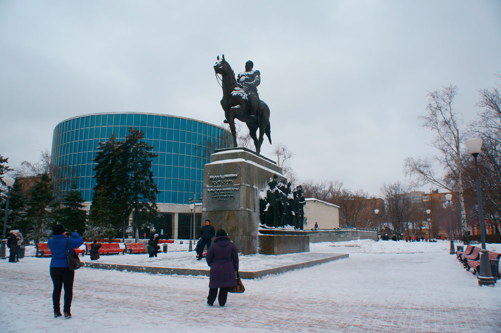 The great commander, the Field Marshal of Russia Mikhail Kutuzov is shown sitting on a war-horse. He is dressed on the parade uniform with all regalia. He confidently is looking on the battle field. There is a big pedestal under the sculpture. There are sculptures of the officers, soldiers and partisans around the pedestal. They follow the commander to protect our homeland from French aggressor. So this monument was dedicated not just in honor of Kutuzov but in honor of all people who had protected our country. There is a memorial inscription on the pedestal: “To Mikhail Illarionovich Kutuzov. In honor of glorious sons of Russia who defeated in Patriotic War of 1812”.