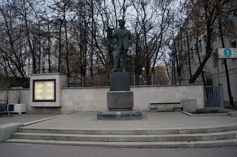 A bronze sculpture of Sergey Vladimirovich was placed on the three-level pedestal which consists of two cylinders and a rectangular foundation. On the top bronze cylinder of the pedestal there is a memorial inscription: “To Sergey Vladimirovich Obraztsov”.