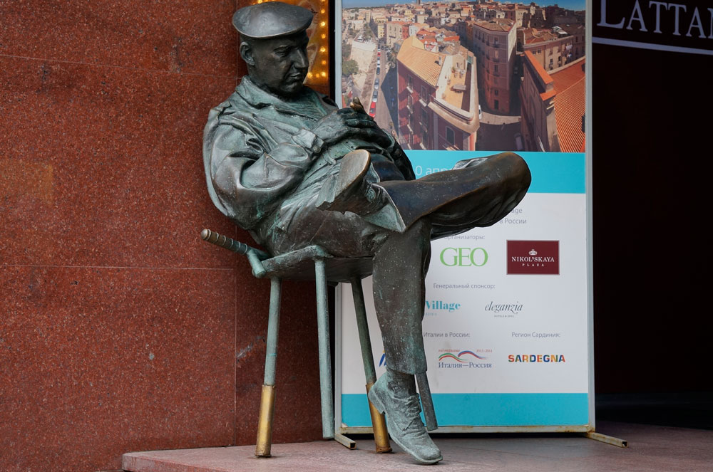 The monument to security guard it is a sculpture of the guard who is sleeping on the chair at the entrance of the shopping center. After long day he has sat on the chair to give the rest to his tired legs. He is sitting and settling back on wall, put his arms on the stomach and put his left leg over right. Behind him there is a rubber truncheon on the chair.
