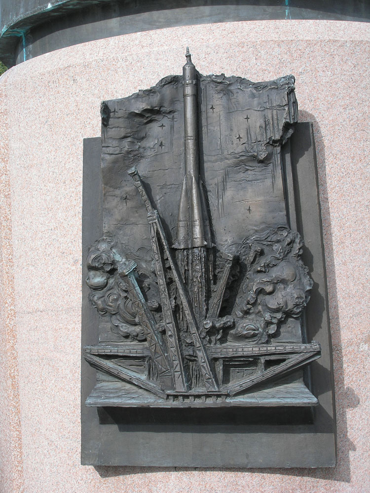 The sculpture of founder of the practical astronautics Sergei Pavlovich Korolev is placed on the high pedestal. He is standing in formal suit and confidently looking into the distance. Maybe he is watching the launching of the rocket. And through condensation trail he is seeing the future of the astronautic and humanity. There are bas-reliefs on the pedestal. The bas-reliefs show the first and main steps to the space. It is a launching the first artificial satellite, the first flight of a human Yuri Gagarin to the space and the first output of Alexey Leonov into open space.