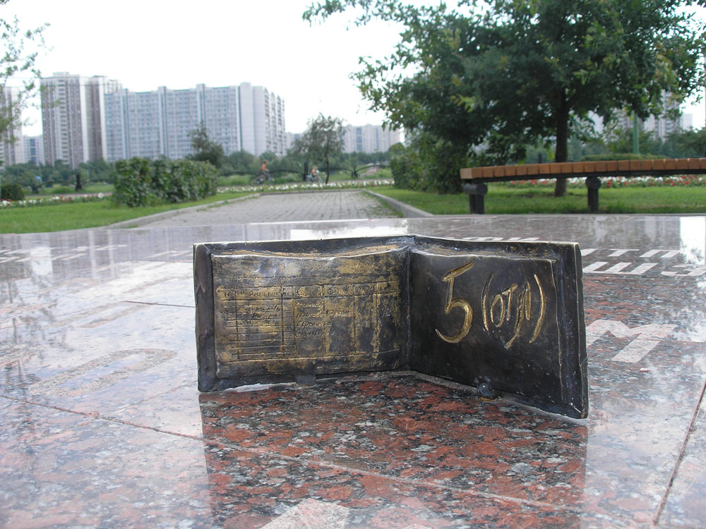 The monument to student signs it is a big round ground from the granite with big coin of 5 kopecks (student’s symbol of the luck during the exams) in the center. Around the coin on the ground there are the abbreviations of the institutes and universities. Also on the ground there are the student’s record-book and pair of shoes with the 5 kopecks inside.
