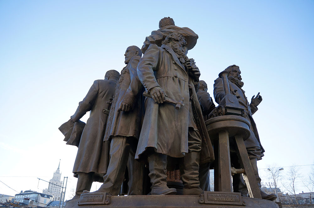 The monument in honor of the founders of Russian railways it is a bronze sculptural composition which consist of the seven sculptures of prominent Russian figures in XIX century. There is a bust of Russian Emperor Nicholas I in the center of the sculptural composition. Around the bust there are six sculptures of the founders of Russian railways: The engineers Cherepanov Yefim Alekseyevich, Cherepanov Miron Yefimovich and Franz Anton von Gerstner, Melnikov Pavel Petrovich – the first minister of Railways of Russia, the prince Khilkov Mikhail Ivanovich and the count Witte Sergei Yulyevich.