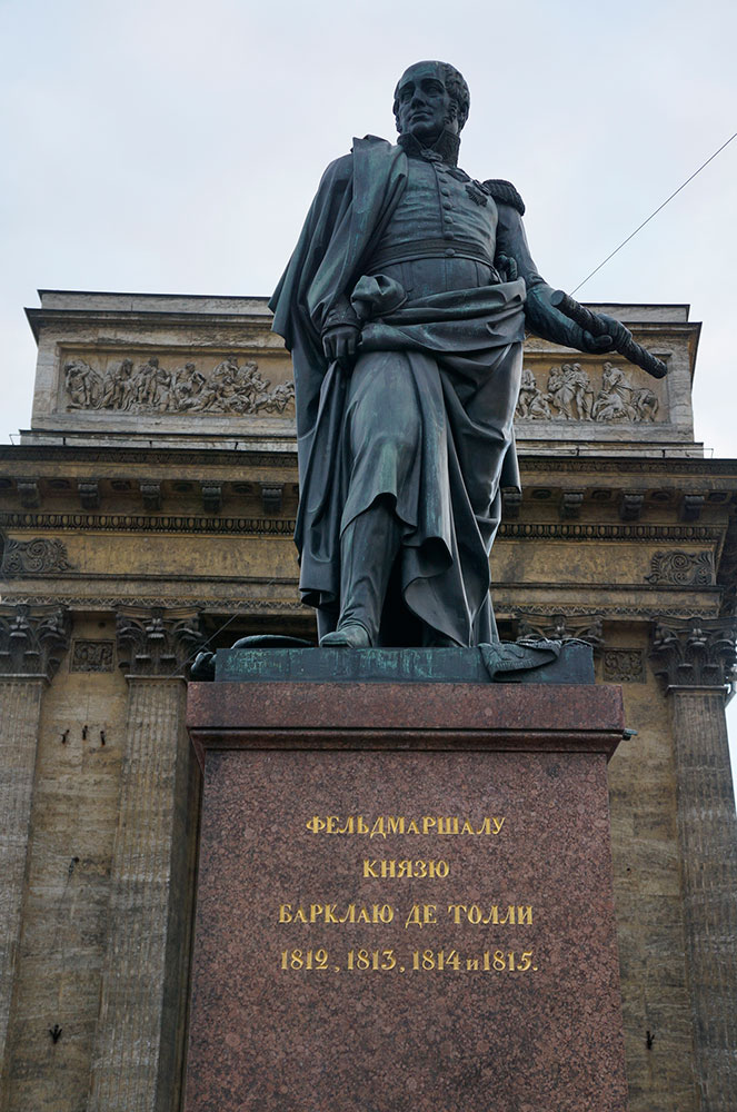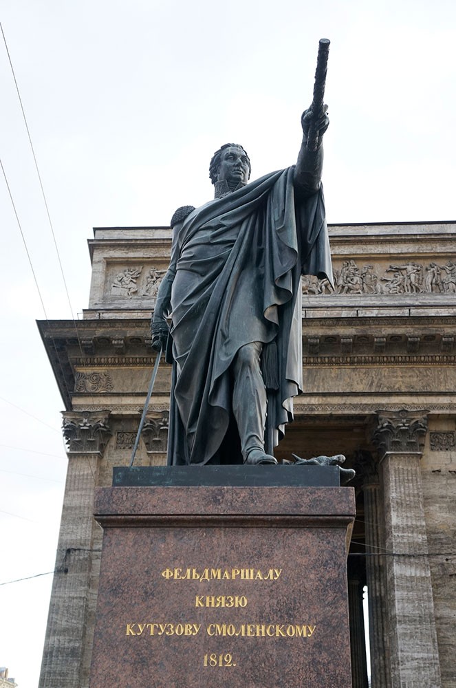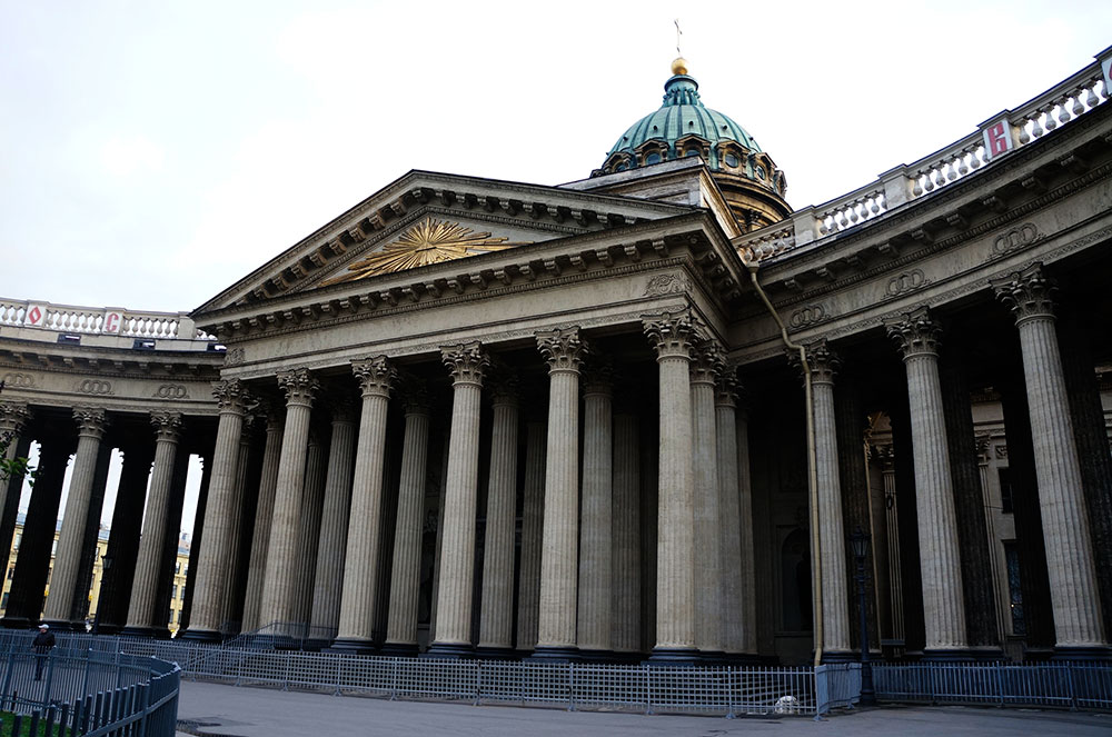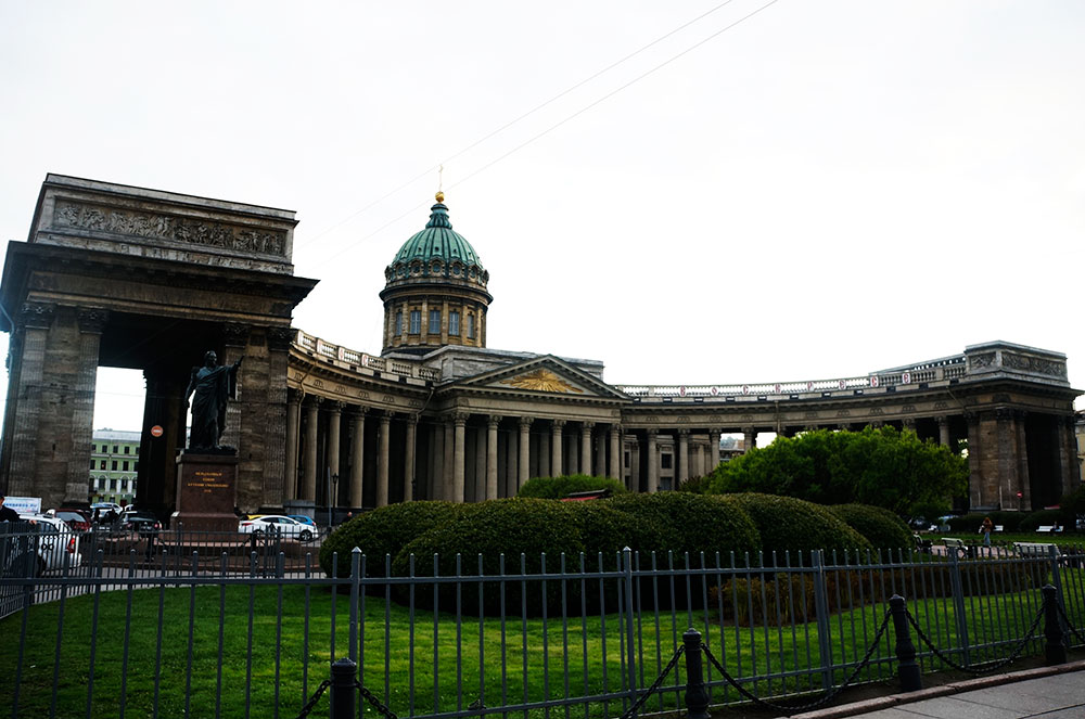 Казанский кафедральный собор является одним из самых больших зданий в Санкт-Петербурге. По желанию императора Павла I собор был построен похожим на собор святого Петра в Риме. Для этого архитектором перед северным фасадом, обращенного на Невский проспект, была построена колоннада из девяносто шести колон. Колоннада выполнена полукругом. У восточной стороны колоннады установлен памятник Михаилу Иларионовичу Кутузову, а у западного края установлен памятник Михаилу Барклаю-де-Толли. Также у северного фасада установлены скульптуры: Андрея Первозванного, Иоанна Крестителя, князя Владимира и Александра Невского.