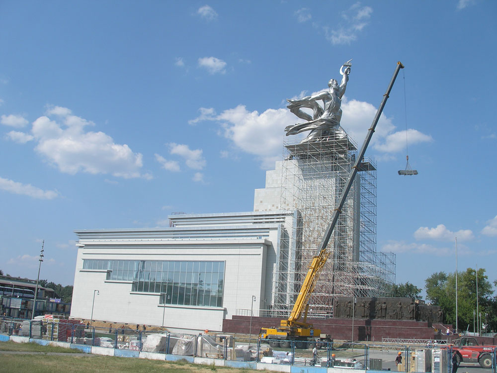 Спустя пол года после того как памятник Рабочему и колхознице после реконструкции был возвращен на ВВЦ, его снова сковали лесами.