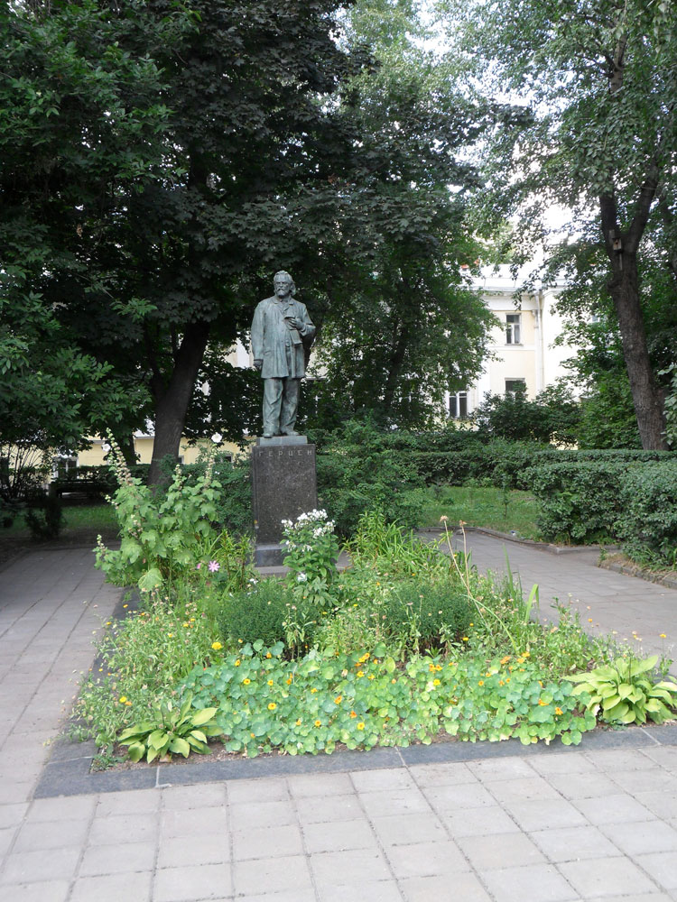 Во дворе Литературного института, что на Тверском бульваре, среди деревьев скромно спрятался памятник яркому писателю публицисту конца 19-го века Александру Ивановичу Герцену. Памятник не большой, представляет собой фигуру Александра Ивановича, запечатленного в полный рос, установлена на невысоком, прямоугольном постаменте. В левой руке он держит гранки революционной газеты “Колокол”.