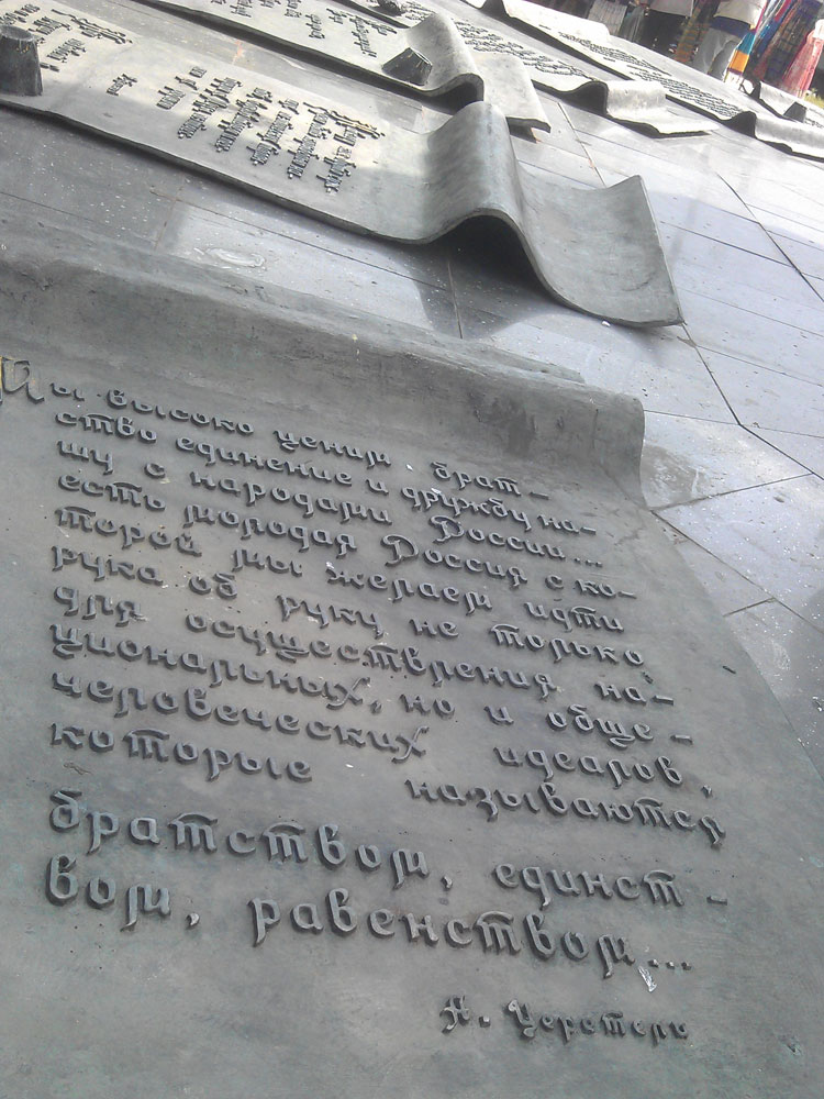 На широком плоском постаменте лежат развернутые свитки с цитатами знаменитых русских и грузинских писателей и поэтов. Своей монументальностью памятник Дружба навеки символизирует крепкую многовековую дружбу между братскими народами России и Грузии. Памятник имеет второе неофициальное название “Шашлык”.