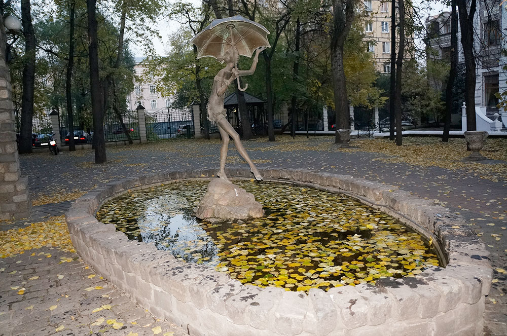 Фонтан – девочка с зонтиком это не большой, но симпатичный фонтан. Он представляет собой низкую, овальную чашу из камня, по периметру которой в центр бьют тоненькие струйки воды. В центре на камешке стоит, худенька и длинноногая девушка в легком платьице и с раскрытым зонтиком в руке. А девочка очень похожа на Пеппи Длинныйчулок. Она босиком гуляет по лужам и выставила из под зонтика руку, проверить кончился ли дождик.