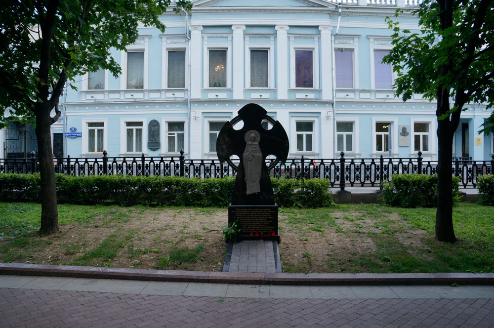 Приезжаете на станцию метро Трубная, и выходите на Трубную площадь. Здесь на перекрестке у памятника “Благодарная Россия” сворачиваете направо на Рождественский бульвар и идете до дома Рождественский бульвар д. 12. Здесь вы увидите памятный крест в честь покровительницы Москвы преподобной Евфросинии.