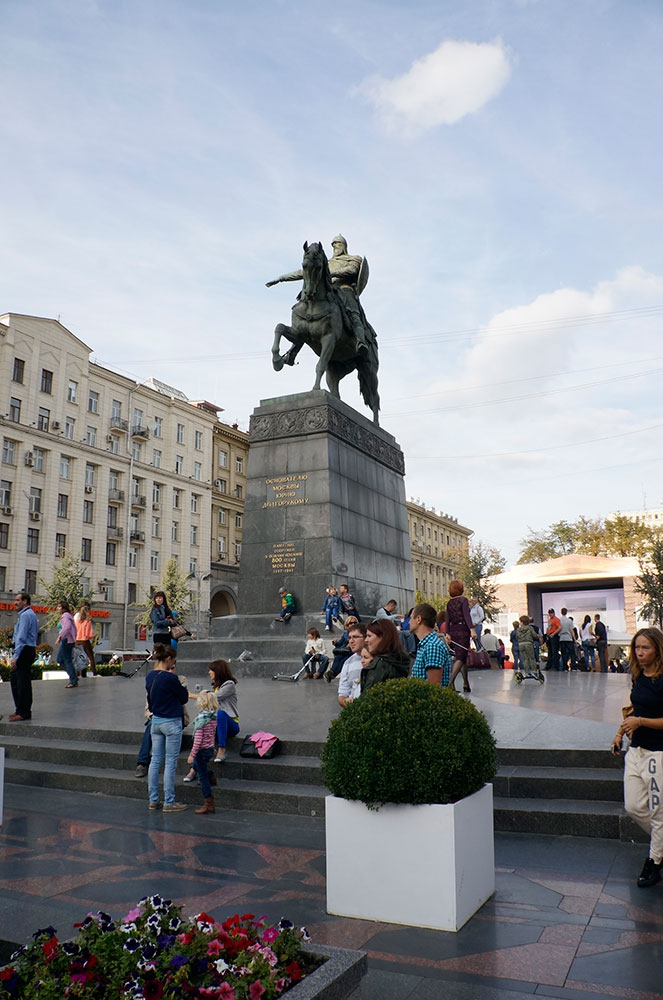 Памятник основателю Москвы Юрию Долгорукому это большая бронзовая скульптура князя ростово-суздальского восседающего на коне, установленная на большом и высоком постаменте. Юрий Долгорукий, восседая на боевом коне, бьющем в нетерпении копытом оземь, повелительным жестом отдает указ основать на месте поселения город.