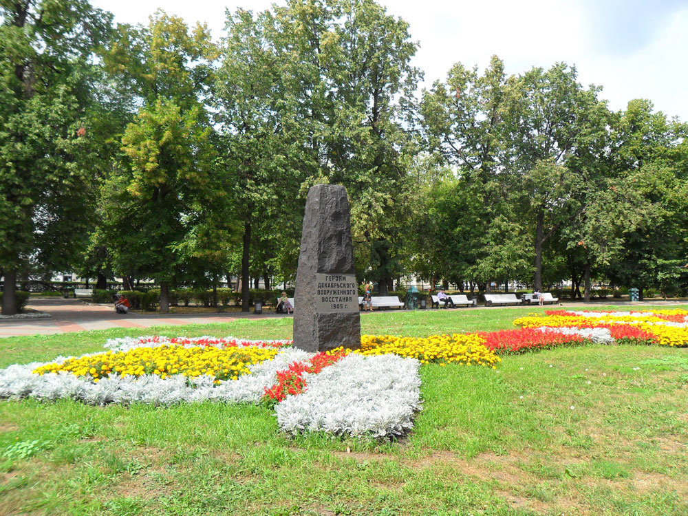 Обелиск выглядит очень просто, необработанный черный камень. На нем выгравирована памятная надпись “Героям декабрьского вооруженного восстания 1905 г.”