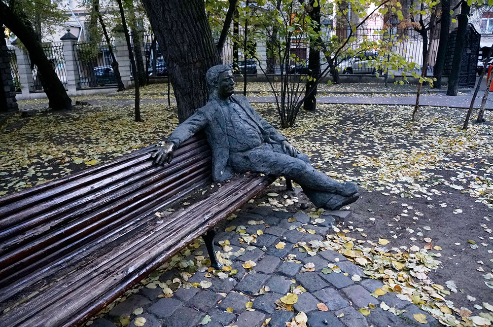 Скульптура – мужчина на скамейке представляет собой довольно крупного мужчину, присевшего на скамейку. Он смотрит на гуляющую рядом девочку с зонтиком, а не далеко собака справляет малую нужду. Скульптура мужчины, так же как и скульптура собаки, выполнена грубо и небрежно и кажется что кисти и лицо выполнены из бронзы, а все остальное тело из бетона.