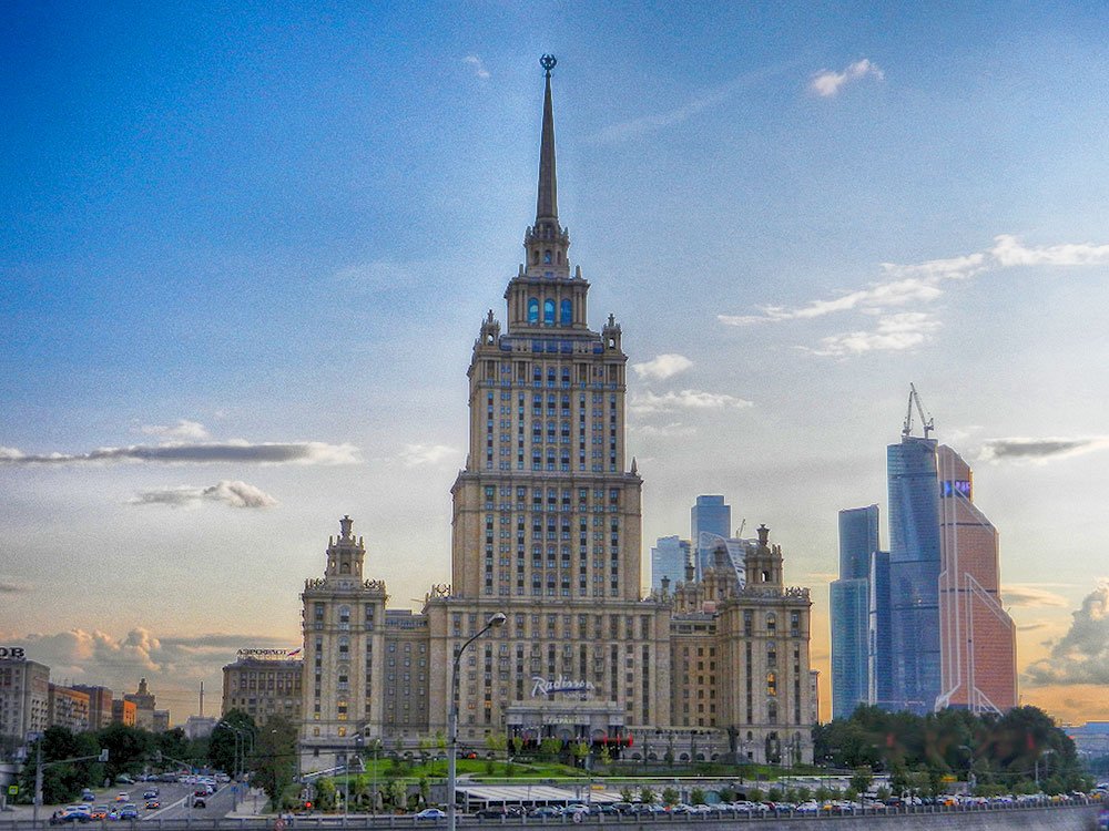 От высотки на площади Красных ворот на автобусе “Б” доезжаете до остановки Кудринская площадь. Выйдя из автобуса, вы сразу увидите прекрасную четвертую сталинскую высотку на Кудринской площади. После высотки на Кудринской площади вы вновь садитесь на автобус “Б” и едете до остановки Смоленская площадь, это прямо напротив пятой сталинской высотки здания МИД России. Если вы еще полны сил, то по Смоленской улице идете к Бородинскому мосту. Переходите мост и по Большой Дорогомиловской улице доходите до перекрестка с Украинским бульваром и поворачиваете направо. По Украинскому бульвару мимо памятника Лесе Украине доходите до кутузовского проспекта. Переходите проспект, и вы у шестой сталинской высотки гостиницы Украина. Если вы пройдете к центральному входу высотки, то на площади перед гостиницей вы найдете памятник великому украинскому писателю Тарасу Шевченко.