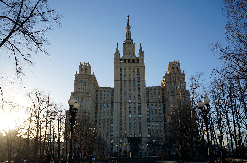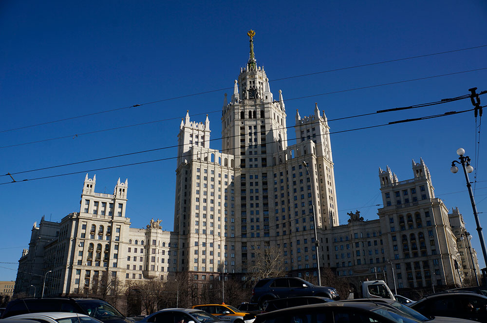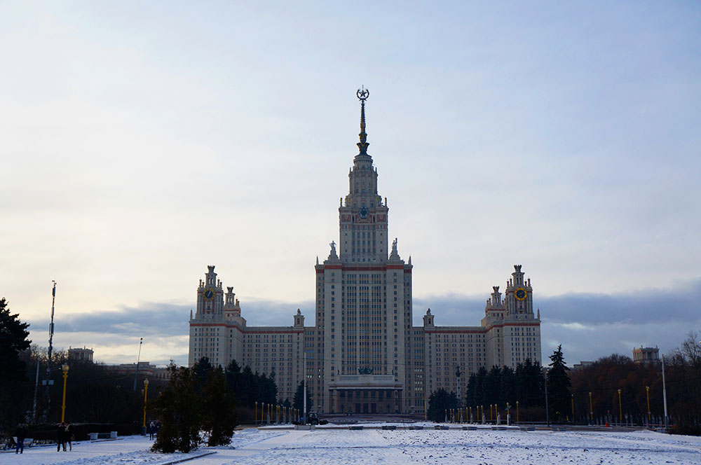 Сталинские высотки это семь высоток: гостиница Ленинградская, дом на Котельнической набережной, здание на площади Красных ворот, дом на Кудринской площади, гостиница Украина, МГУ и конечно здание МИДа, расположенных по всей Москве. Отличительной особенность высоток является их архитектурный стиль советский арт-декор или как его еще называют сталинский ампир. Построены они с размахом и особым шиком и заметно выделяются на фоне общей архитектуры столицы и несомненно являются визитной карточкой Москвы. Не смотря на то что высотки разбросаны по всей всему городу их все можно увидеть из одного места, это прекрасная смотровая площадка на Воробьевых горах.