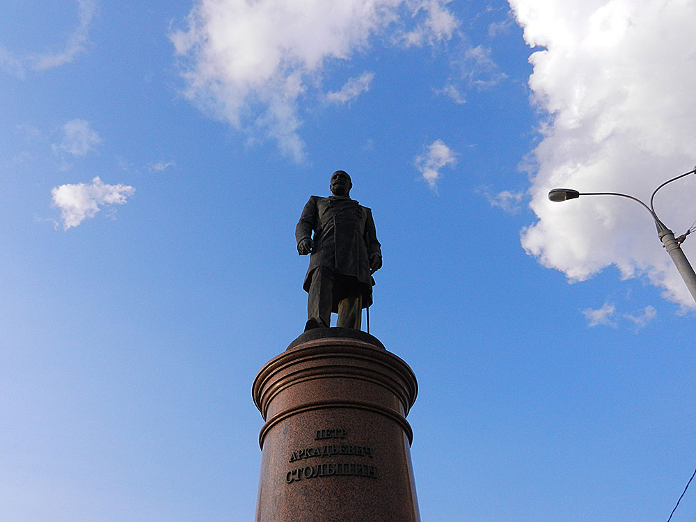 Памятник российскому государственному деятелю Петру Аркадьевичу Столыпину это бронзовая скульптура Петра Аркадьевича в полный рост, высотой более 3,5 метров. Скульптура расположена на цилиндрическом постаменте, высотой около 4.5 метров и изготовленного из гранита. На постаменте нанесена памятная надпись: “Петр Аркадьевич Столыпин”. На нижней расширенной части постамента расположена бронзовая табличка с памятной надписью: “В деле защиты России мы все должны соединить, согласовать свои усилия, свои обязанности и свои права для поддержания одного исторического высшего права России – быть сильной!”.
